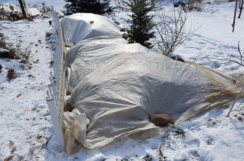 Сверху накрывают двумя слоями лутраксила или спанбонда. Поверх лутраксила для надежности расстилают полиэтиленовую пленку и закрепляют ее дугами. Использование лутраксила без пленки может привести к тому, что во время оттепели внутри укрытия появится влага, которая при морозе образует на растениях слой льда.