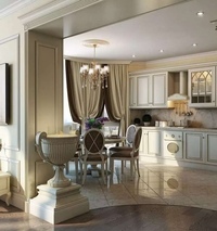 Кухня. Интерьер кухни в классическом стиле хоть и должен быть роскошным, но на первое место здесь всё же выходит практичность. Чтобы современная техника не вносила дисбаланс в общую гармонию, её лучше всего замаскировать «под дерево» или же, если позволяют габариты, спрятать внутрь деревянных шкафчиков. В центре такой кухни размещают большой обеденный стол с мраморной столешницей, а пол покрывают паркетом.