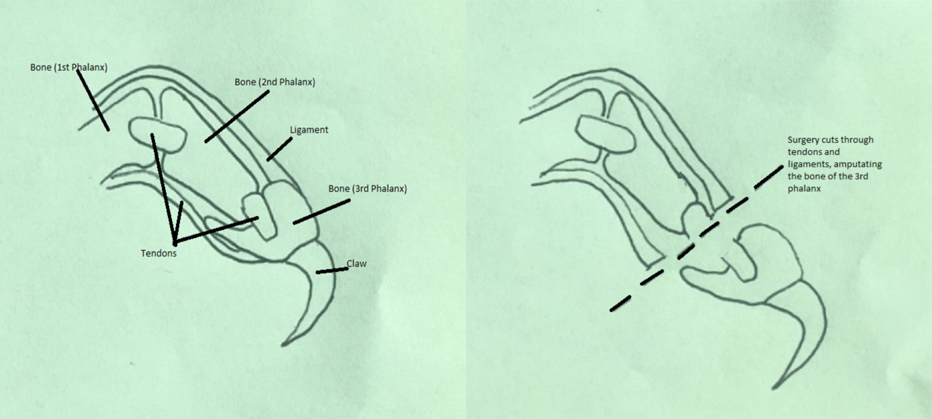 Операция по удалению когтей — это 10 отдельных операций по ампутации (18, если также удаляются задние когти). Это не стрижка когтей и не просто удаление когтей. Чтобы удалить кошачьи когти и предотвратить их повторное отрастание, необходимо навсегда удалить ткань, из которой растет коготь. Это означает ампутацию каждого пальца кошки до первого сустава.