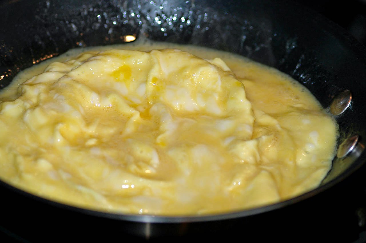 - Заметили, что края стали светлее и тверже? Когда у вас получится прочный внешний край легкого вареного яйца, омлет готов переворачивать. Этот омлет еще не готов, но начинает подавать признаки.