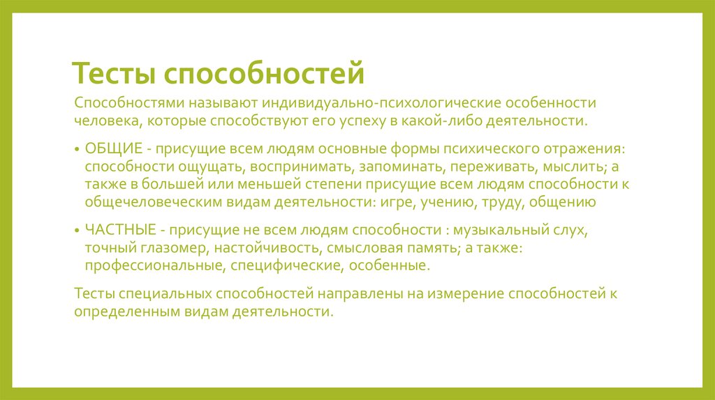 Существует целый ряд необычных способностей, среди самых известных можно назвать ясновидение, предвидение, бессловесное внушение, телекинез, способность к биоэнерготерапии, умение влиять на вероятность событий. Для обнаружения таких способностей можно провести серию тестов.